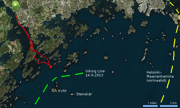 Laivayhtiön sivujen mukaan kyseessä on 171,5 metriä pitkä M/S Gabriella [Wikipedia] matkalla Maarianhaminasta Helsinkiin. Laitoin kyselyä oudosta reitistä.